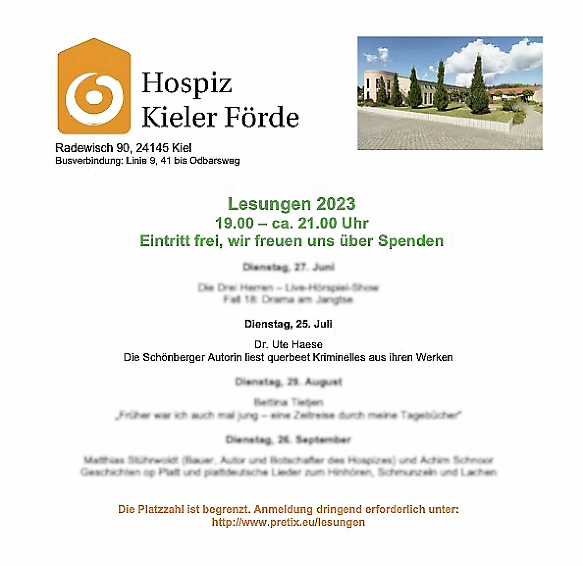 Gerade bei einer Krimi-Lesung tun sich da spontan doch etwas zwiespältige Gefühle auf. Umso schöner und wichtiger wäre es deshalb, wenn trotzdem möglichst viele Interessierte am 25. Juli den Weg hierher finden würden. Denn sämtliche Einnahmen kommen dem Hospiz zugute, dessen engagiertes Team sich Jahr für Jahr um ein abwechslungsreiches, für seine Gäste passendes Programm bemüht. Was in diesem Fall bedeutet, dass mit Hanna Hemlokk bei aller krimitypischen Spannung die komischen Aspekte ihrer Ermittlungsmethoden und der Einblick in ihre Nebentätigkeit als Liebesgeschichten schreibende "Tränenfee" die Atmosphäre prägen werden.