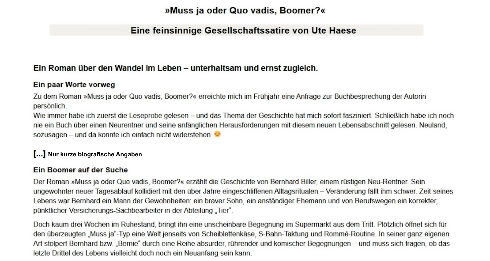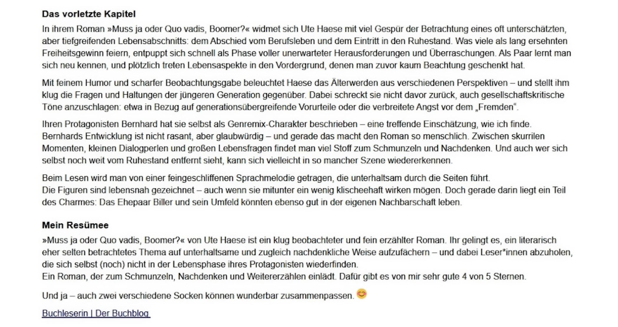 Lovelybooks: https://www.lovelybooks.de/autor/Ute-Haese/Muss-ja-oder-Quo-vadis-Boomer--17672427746-w/rezension/20486992849/